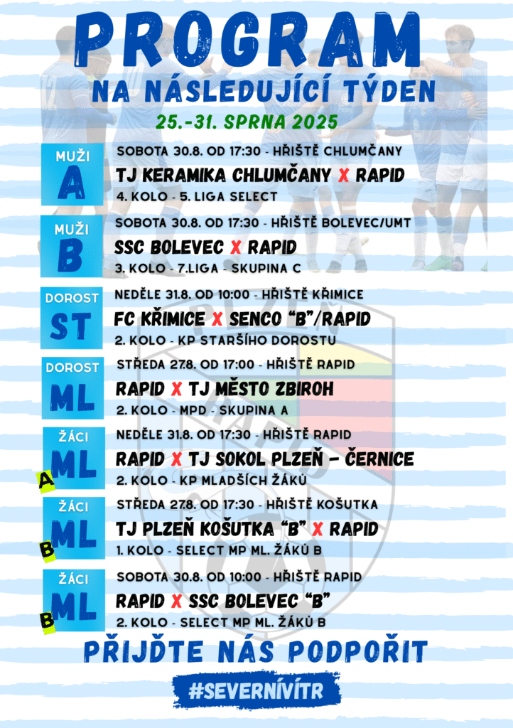 RAPID PLZEŇ fotbal, z.s. > A-TÝM > Poslední prázdninový týden se na Rapidu představí pouze mladší dorost a žáci. Většinu kategorií čeká venkovní utkání, včetně obou mužských celků.